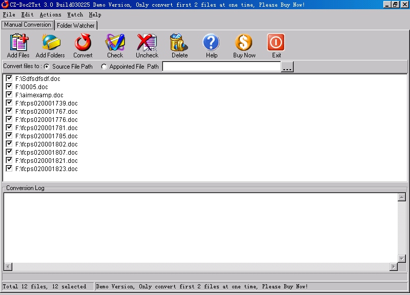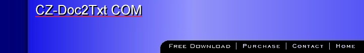SPECIAL PROMOTION! (GREAT VALUE ONLY FOR A LIMITED TIME! OFFER OF ONLY $219 U.S. CURRENT VERSION! ) To introduce CZ-Doc2Txt COM, we are offering a $219 SPECIAL LIMITED TIME OFFER for this version! Click here to order now! Here is a quick overview of the benefits and features: CZ-Doc2Txt COM Overview: batch text converter that convert doc to text, html to text and rtf to text, it can be called from VB, VC, DELPHI. Try the free trial version first, or click here for pricing/to purchase a full version! Order by phone, fax, cheque, money order, or order securely online! |
